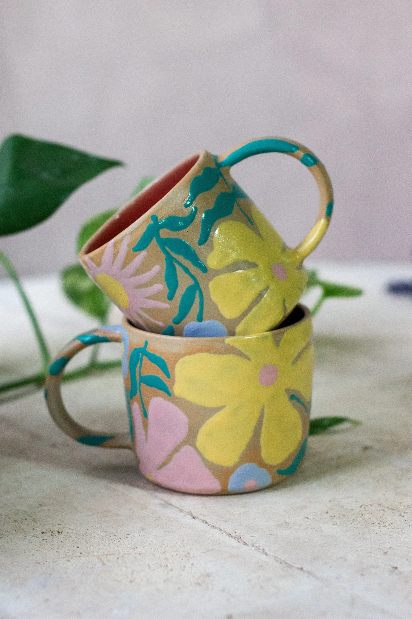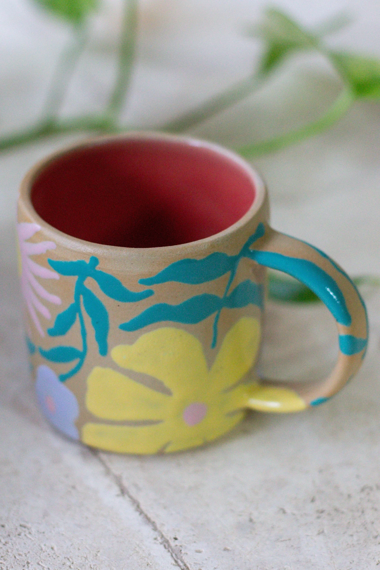 This wheel‑thrown mug is made from white stoneware clay and hand‑painted with a bold, floral design. Playful oversized blooms wrap around the exterior, giving the piece a bright, cheerful feel that stands out in everyday use. Finished with a smooth, food‑safe glaze and a glossy interior, each mug is painted by hand and completely unique.