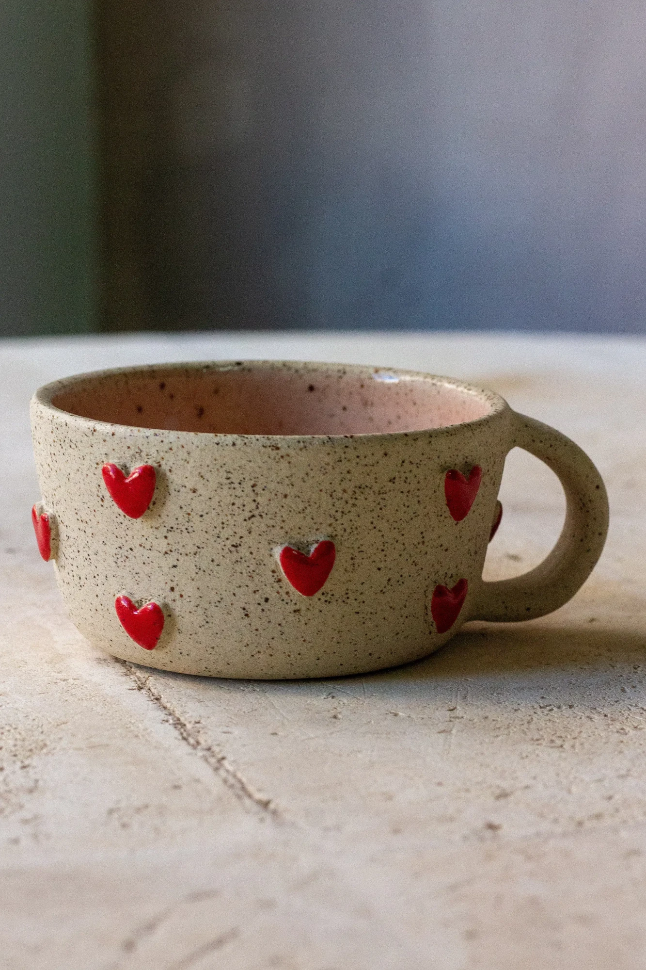 This wheel-thrown mug is made from speckled stoneware clay and decorated with small, hand-painted red hearts. The softly rounded form and comfortable handle make it ideal for everyday use, while a hidden heart painted inside adds a playful, thoughtful detail revealed with every sip. Finished with a smooth, food-safe glaze, each mug is made and painted by hand, making every piece unique.