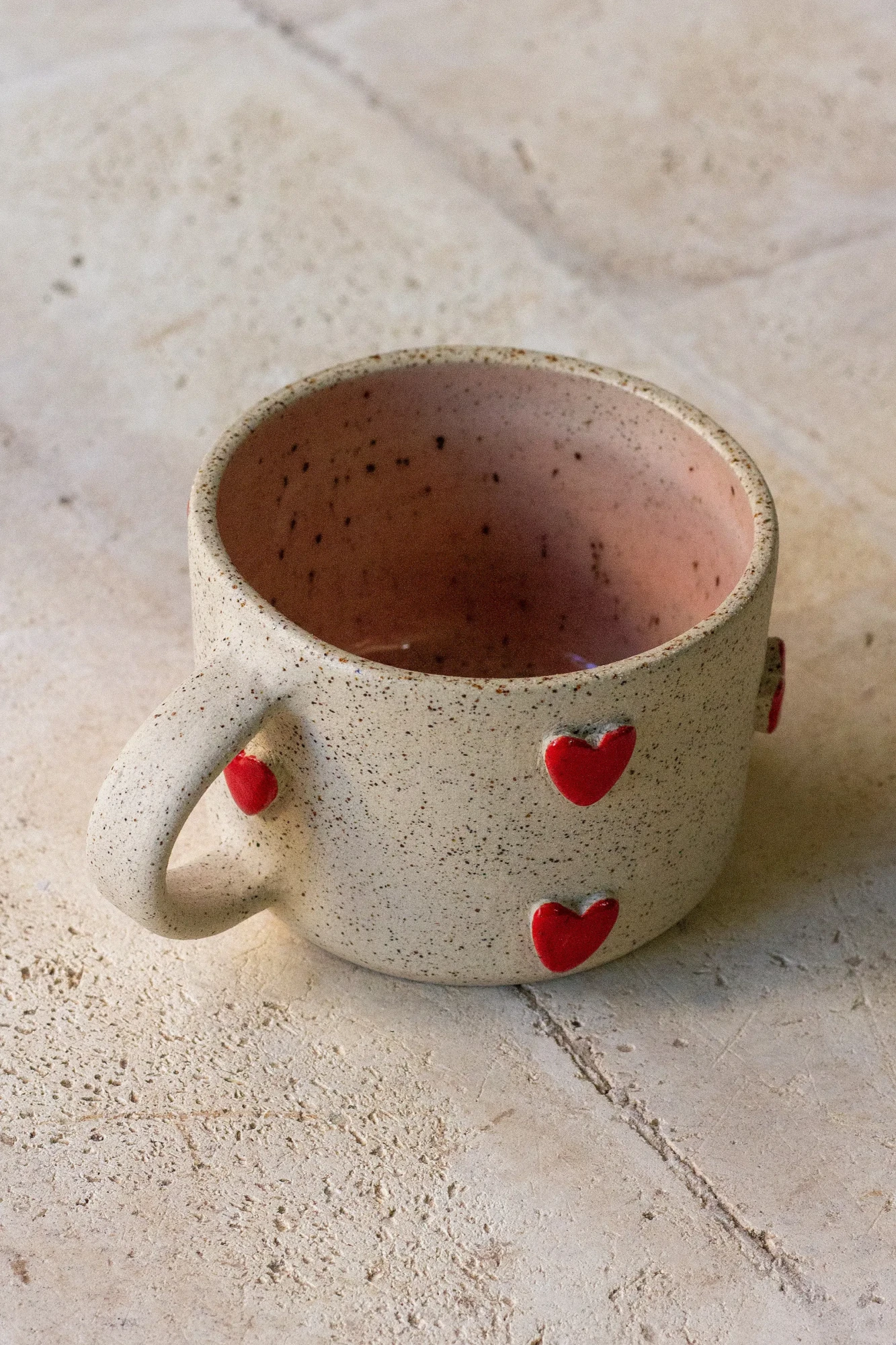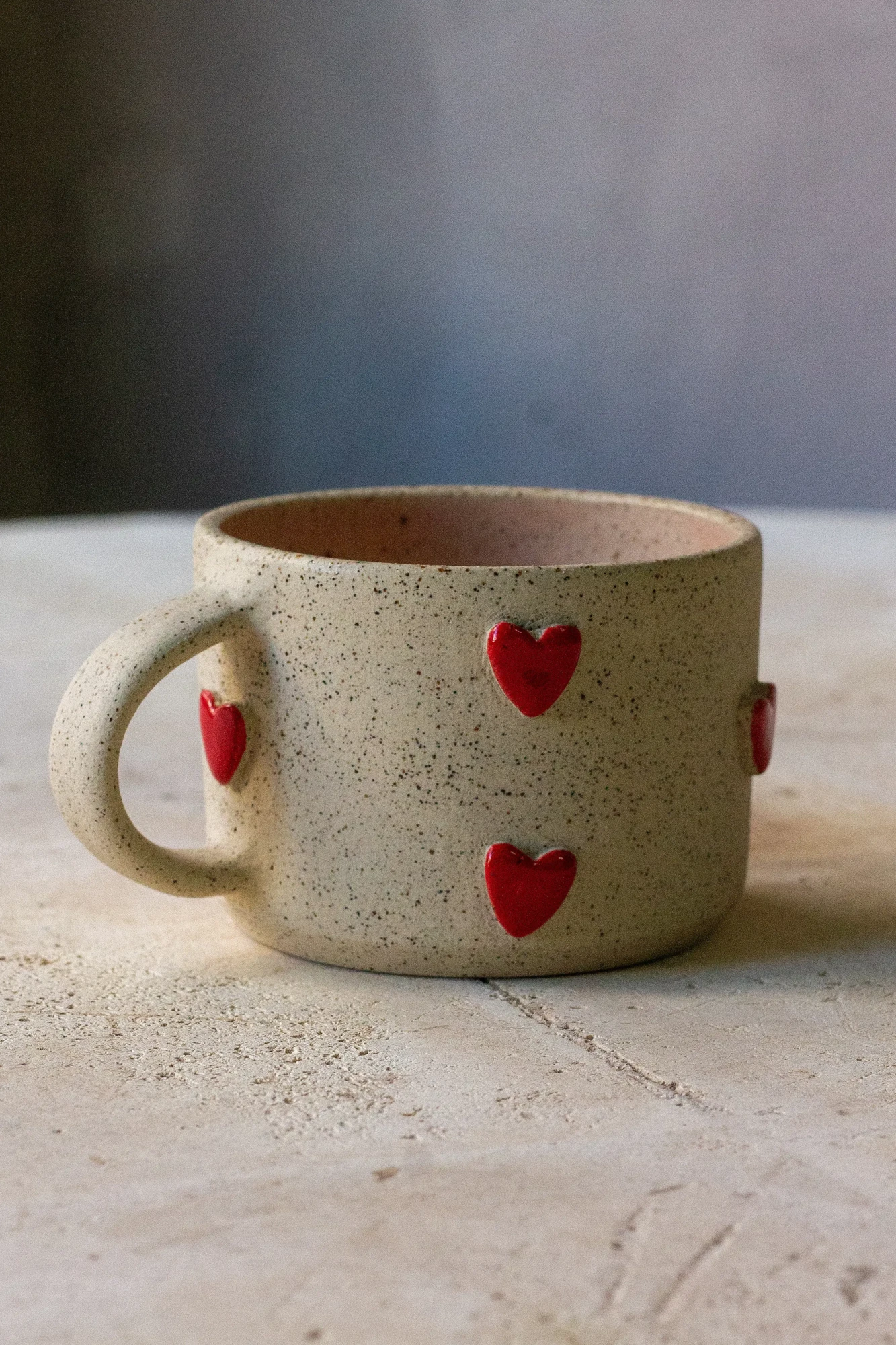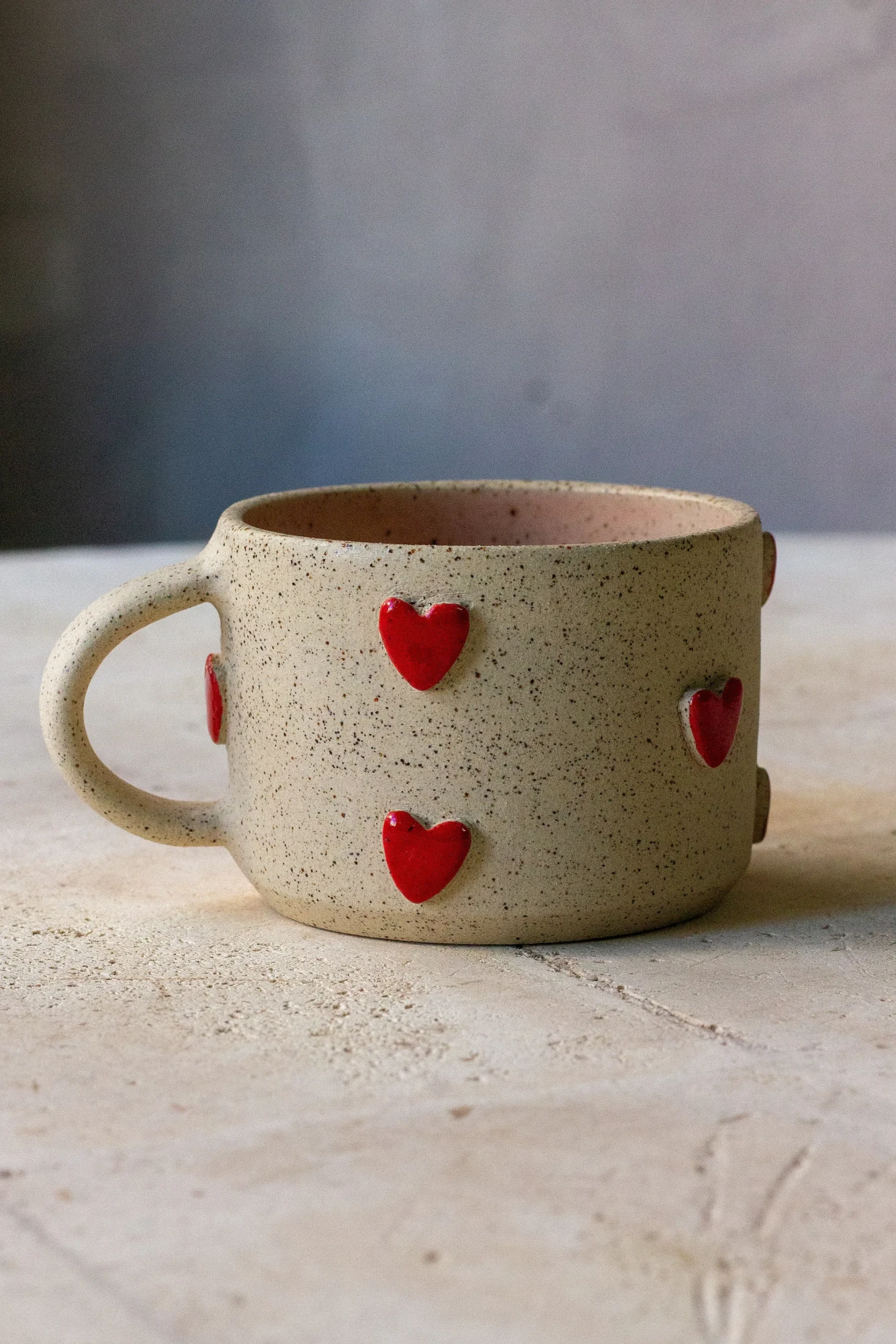 This wheel-thrown mug is made from speckled stoneware clay and decorated with small, hand-painted red hearts. The softly rounded form and comfortable handle make it ideal for everyday use, while a hidden heart painted inside adds a playful, thoughtful detail revealed with every sip. Finished with a smooth, food-safe glaze, each mug is made and painted by hand, making every piece unique.