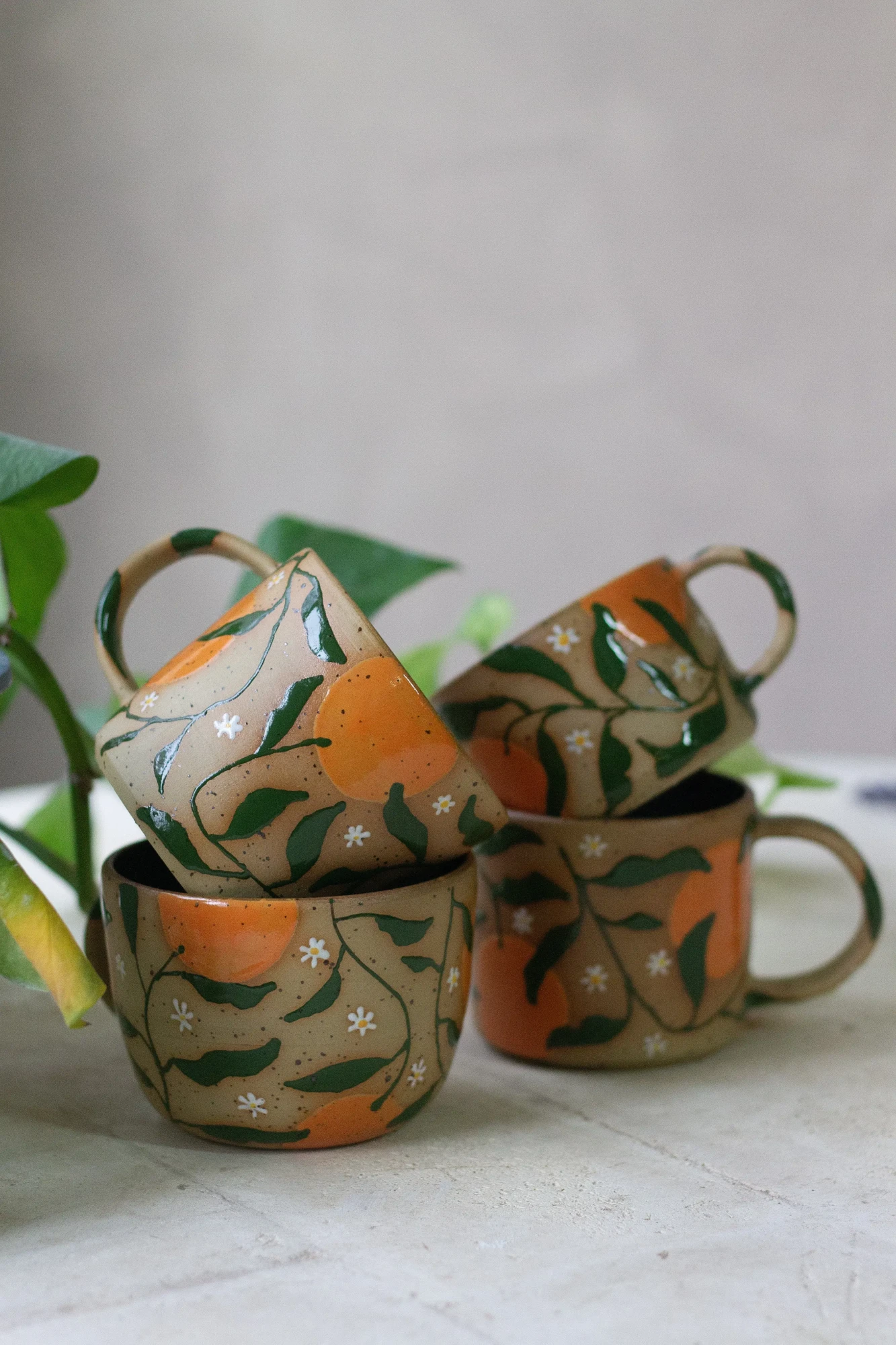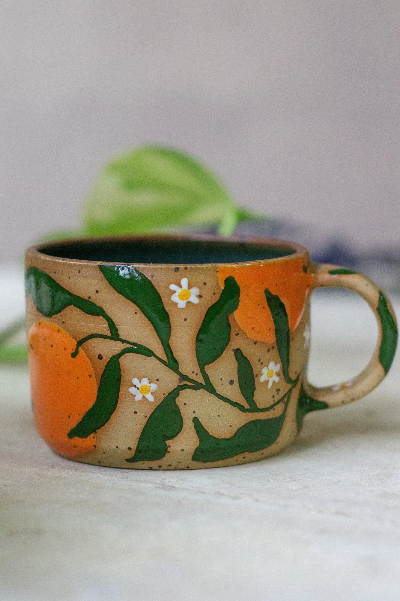 This wheel-thrown mug is made from speckled stoneware clay and hand-painted with a warm citrus-inspired design. A bold orange fruit is framed by flowing green leaves and small white blossoms, creating a cheerful, Mediterranean feel. The straight-sided form and comfortable handle make it perfect for everyday use, while the natural clay body adds warmth and character. Finished with a smooth, food-safe glaze, each mug is painted by hand and one of a kind.