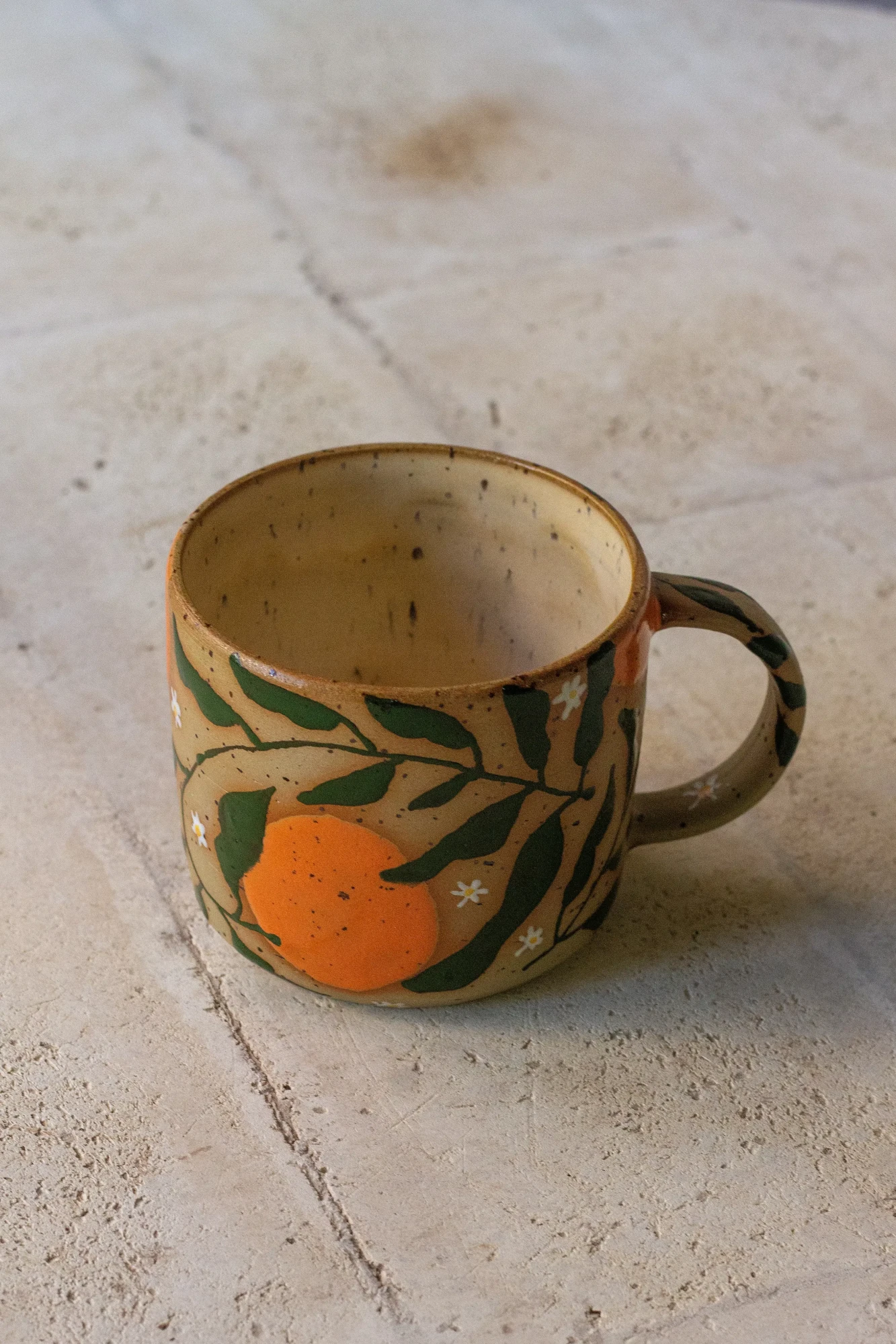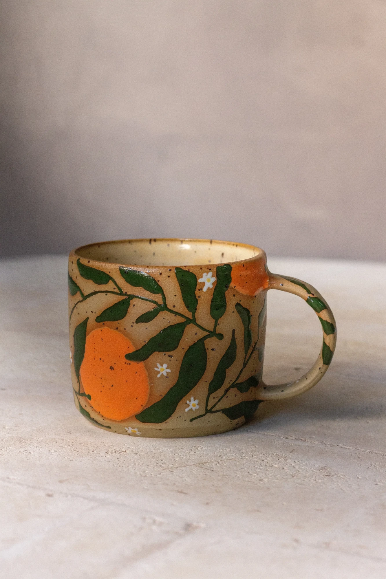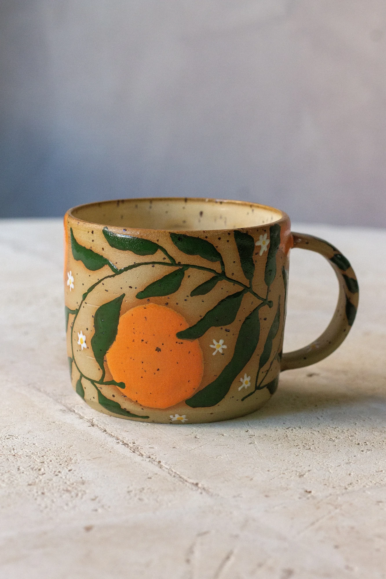 This wheel-thrown mug is made from speckled stoneware clay and hand-painted with a warm citrus-inspired design. A bold orange fruit is framed by flowing green leaves and small white blossoms, creating a cheerful, Mediterranean feel. The straight-sided form and comfortable handle make it perfect for everyday use, while the natural clay body adds warmth and character. Finished with a smooth, food-safe glaze, each mug is painted by hand and one of a kind.