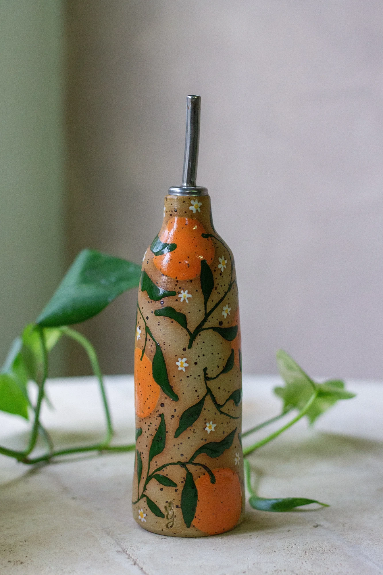 This wheel-thrown oil dispenser is made from speckled stoneware clay and hand-painted with bold floral and fruity details. Vivid orange blossoms are paired with flowing leaves brushstrokes, creating a striking, graphic pattern against the warm clay body. Finished with a pouring dispenser, this piece balances expressive decoration with everyday function.