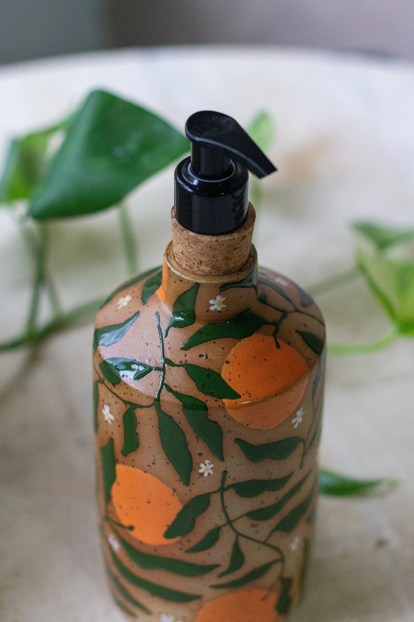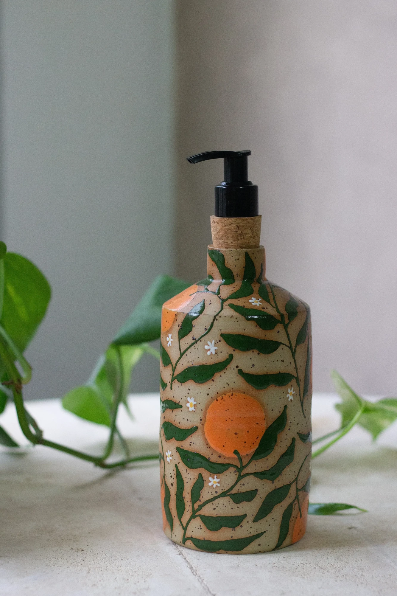 This wheel-thrown soap dispenser is made from speckled stoneware clay and hand-painted with bold floral and fruity details. Vivid orange blossoms are paired with flowing leaves brushstrokes, creating a striking, graphic pattern against the warm clay body. Finished with a black pump and cork collar, this piece balances expressive decoration with everyday function.