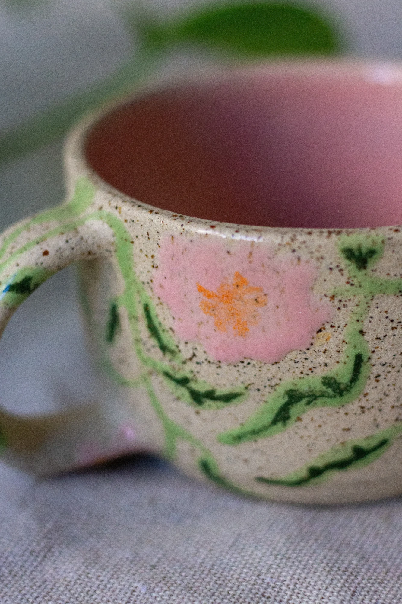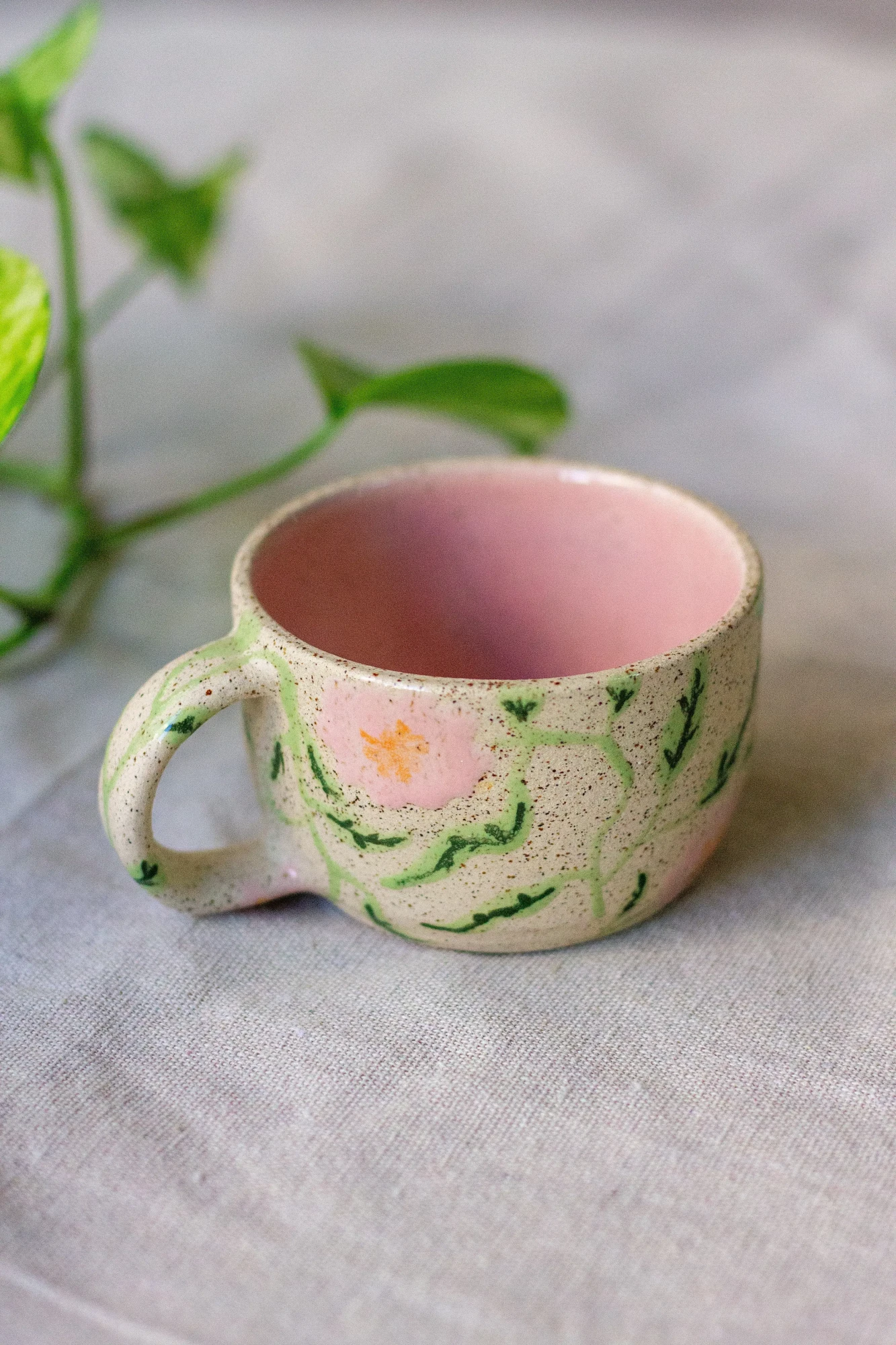 This wheel-thrown coffee is made from speckled stoneware clay and hand-painted with soft floral details. Flowing green leaves and pale pink blossoms create a calm, botanical feel, while the warm clay body adds natural character.