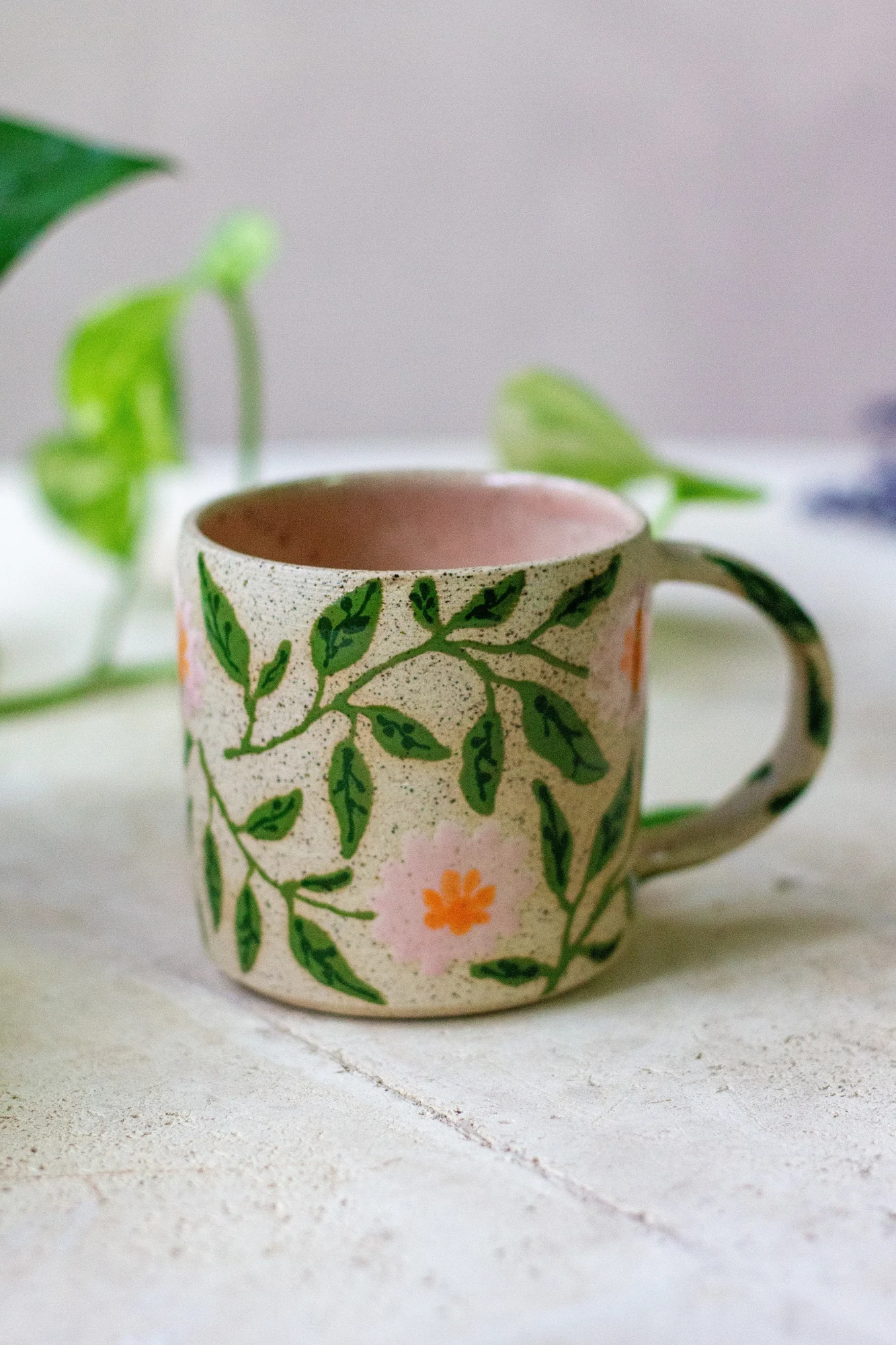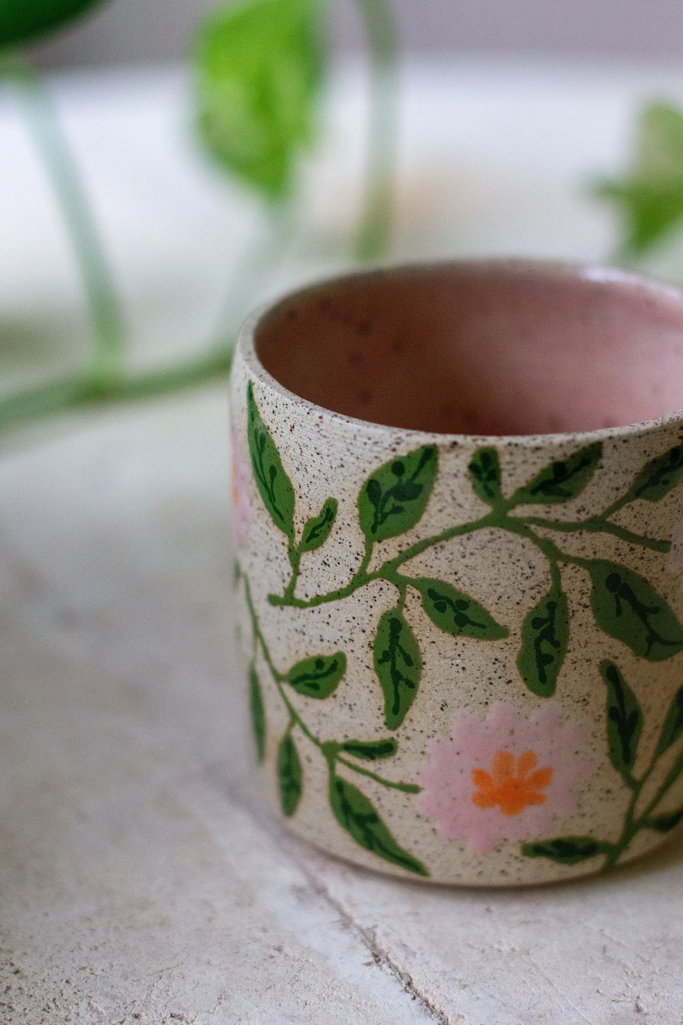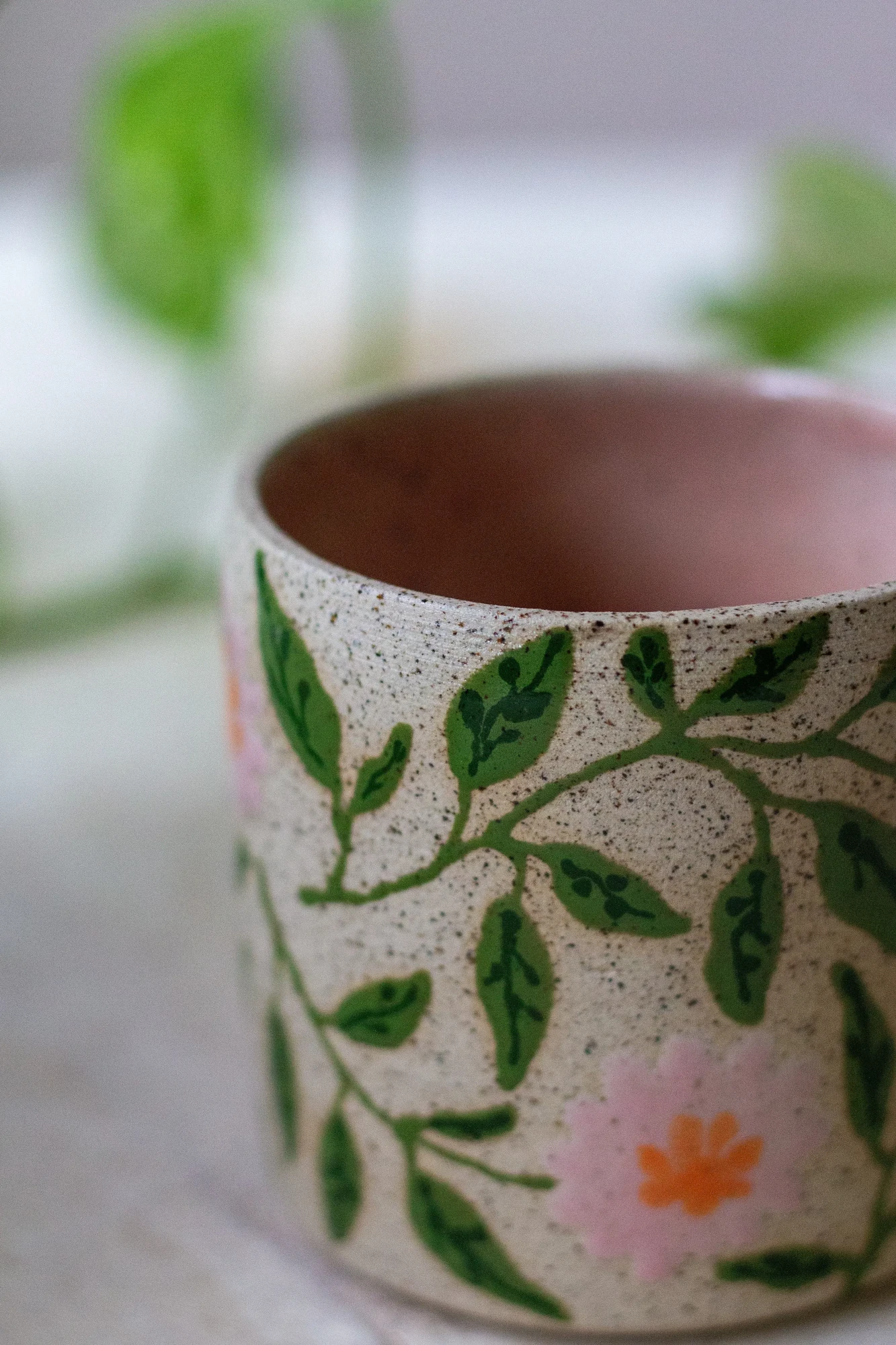 This wheel-thrown bowl is made from white stoneware clay and hand-painted with soft floral details. Flowing green leaves and pale pink blossoms create a calm, botanical feel, while the warm clay body adds natural character.