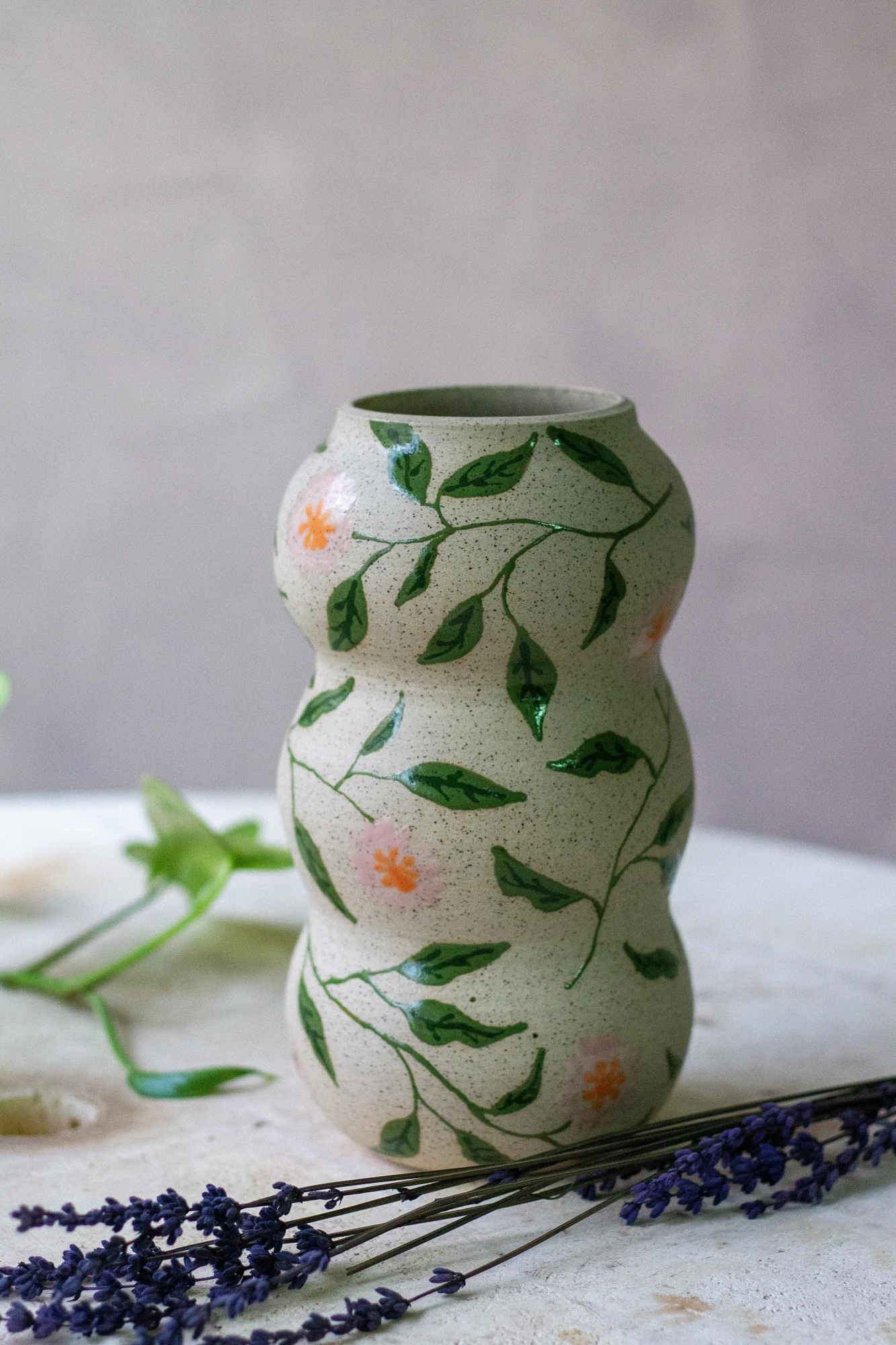 This wheel-thrown vase is made from white speckled stoneware clay and hand-painted with soft floral details. Flowing green leaves and pale pink blossoms create a calm, botanical feel, while the warm clay body adds natural character.