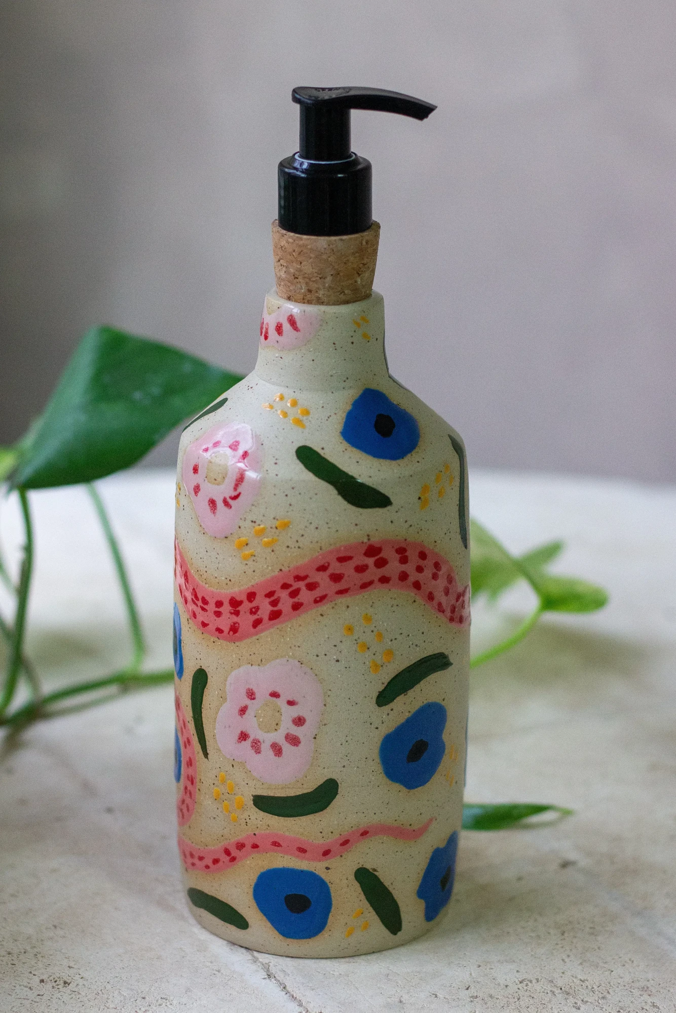 This wheel‑thrown soap dispenser is made from white stoneware clay and hand‑painted with a flowing snake design. The illustrated serpent wraps around the exterior in a soft, organic pattern that gives the piece a playful, botanical feel. Finished with a smooth, food‑safe glaze interior, painted by hand and completely one of a kind.