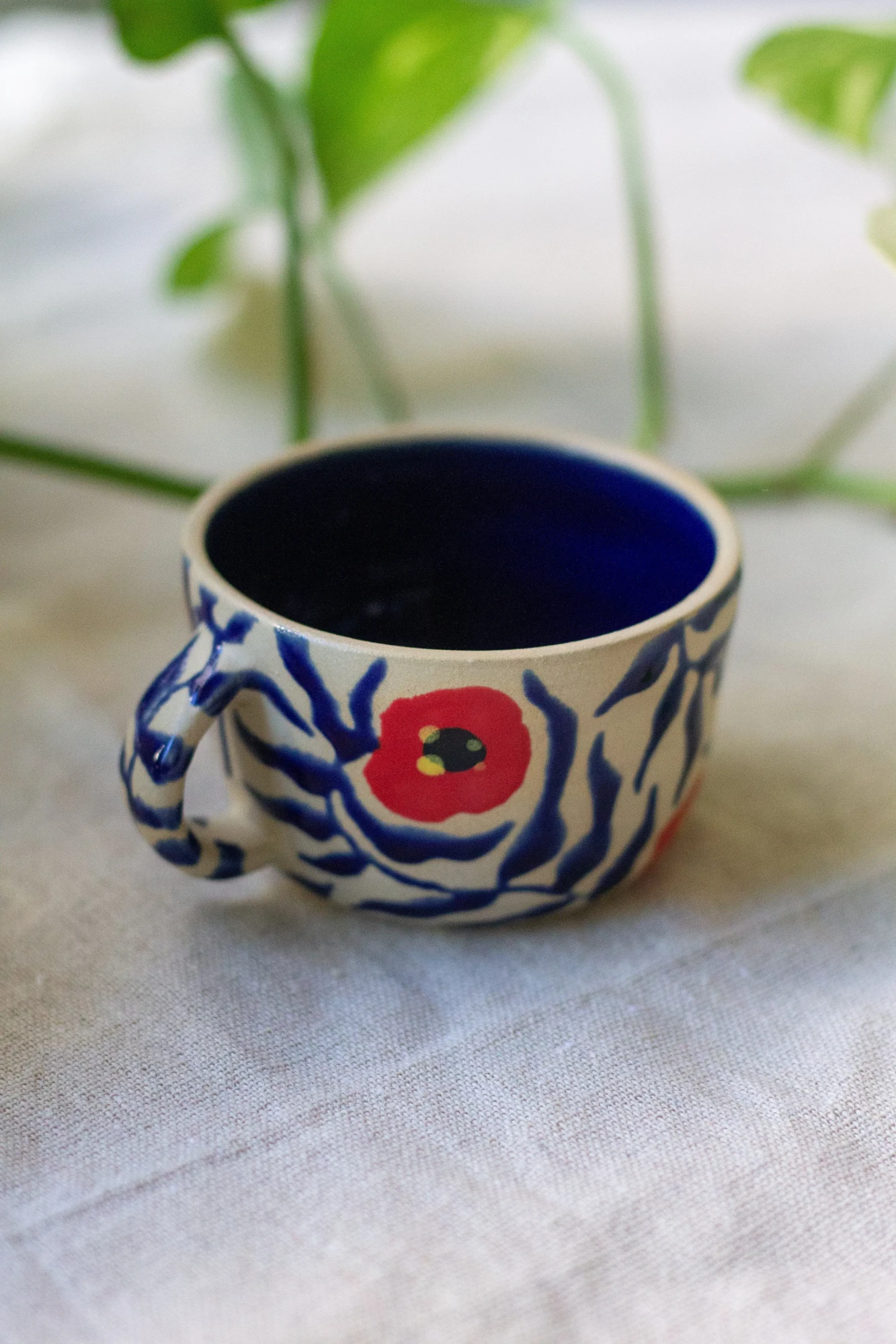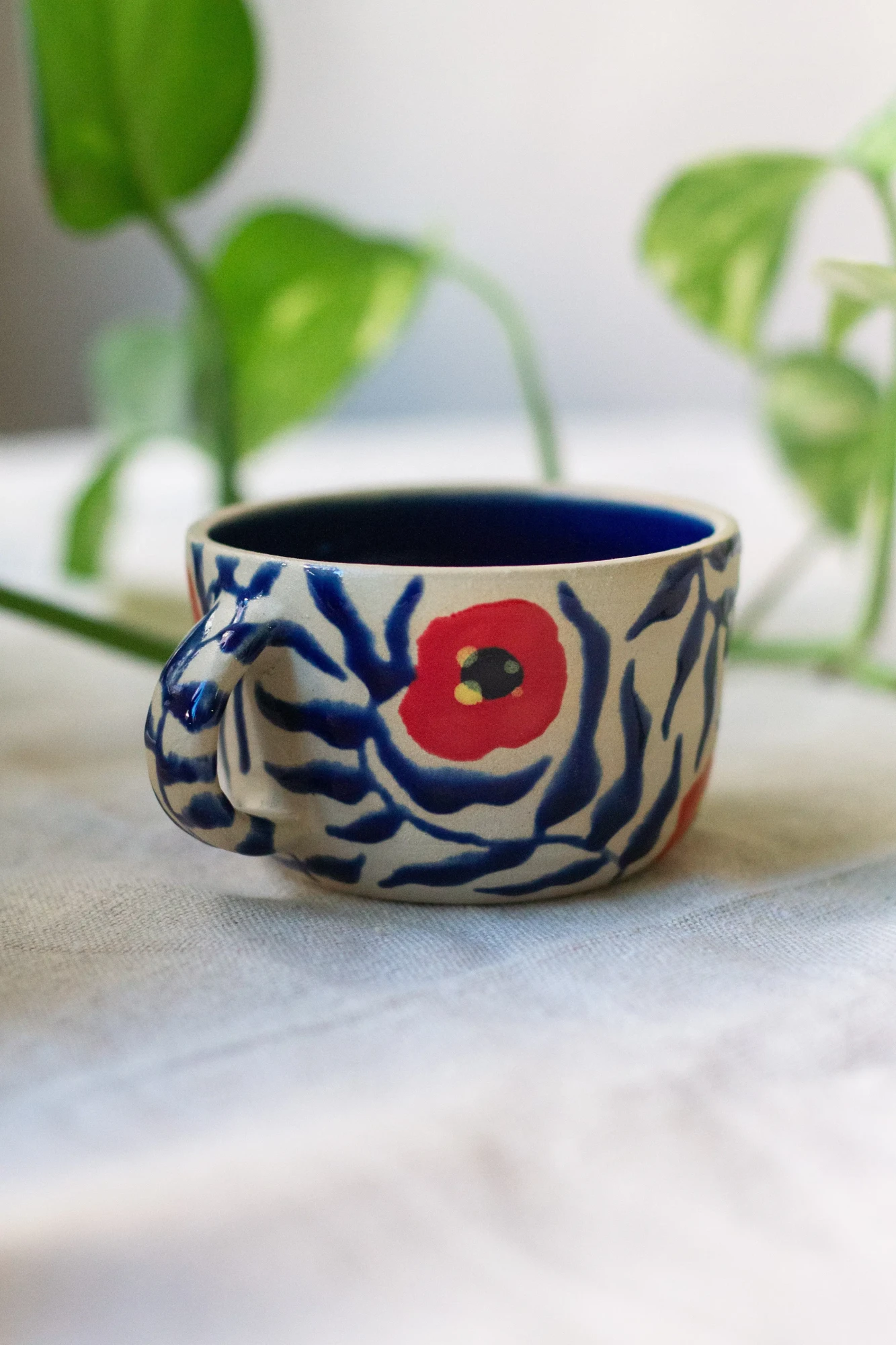 This wheel-thrown mug is made from white stoneware clay and hand-painted with bold poppy motifs. Vivid red blossoms and flowing cobalt-blue brushstrokes create a striking, graphic pattern that wraps around the form. Finished with a smooth, food-safe glaze, the coffee mug balances expressive decoration with everyday functionality.