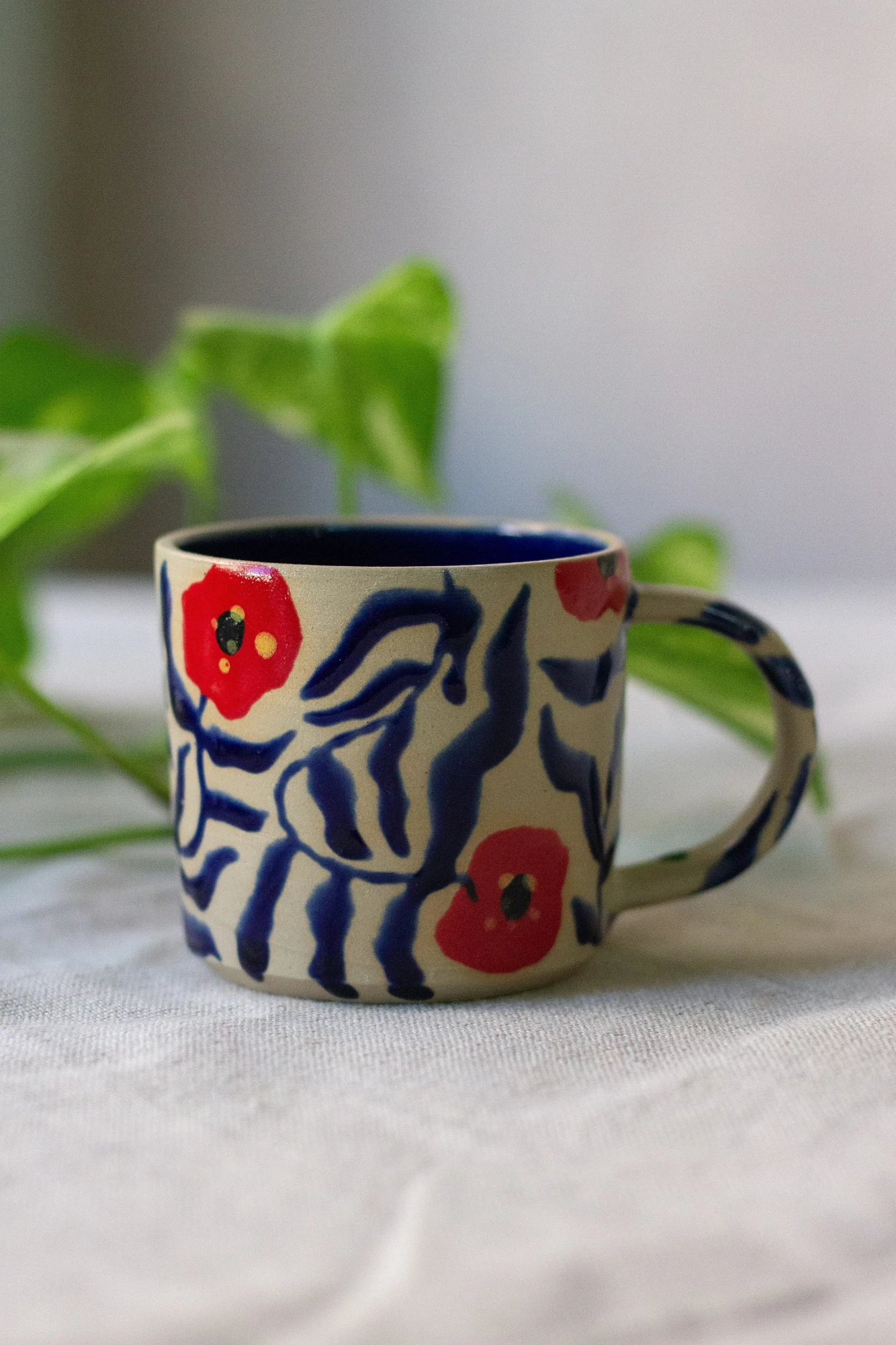 This wheel-thrown mug is made from white stoneware clay and hand-painted with bold poppy motifs. Vivid red blossoms and flowing cobalt-blue brushstrokes create a striking, graphic pattern that wraps around the form. Finished with a smooth, food-safe glaze, the coffee mug balances expressive decoration with everyday functionality.