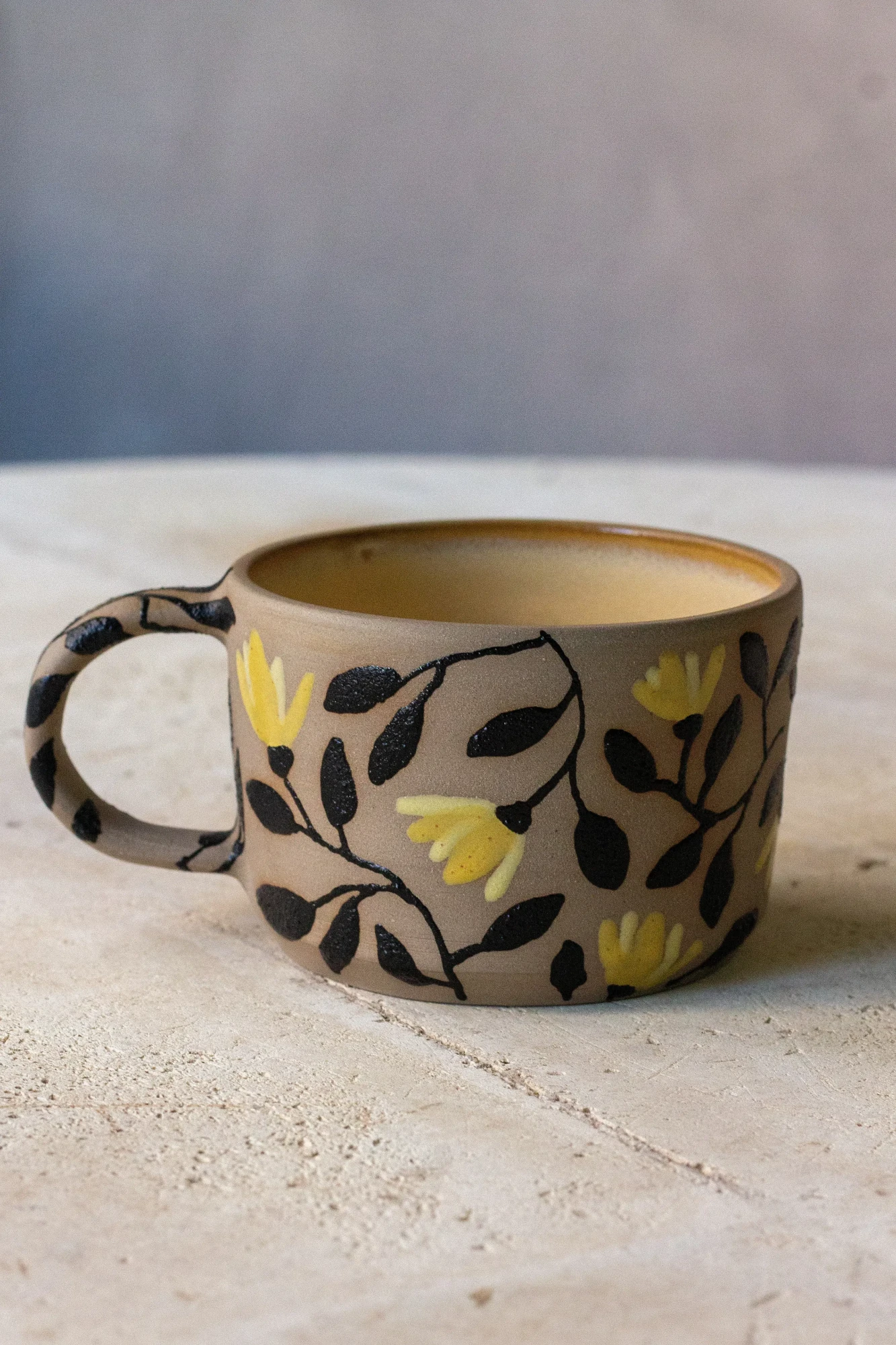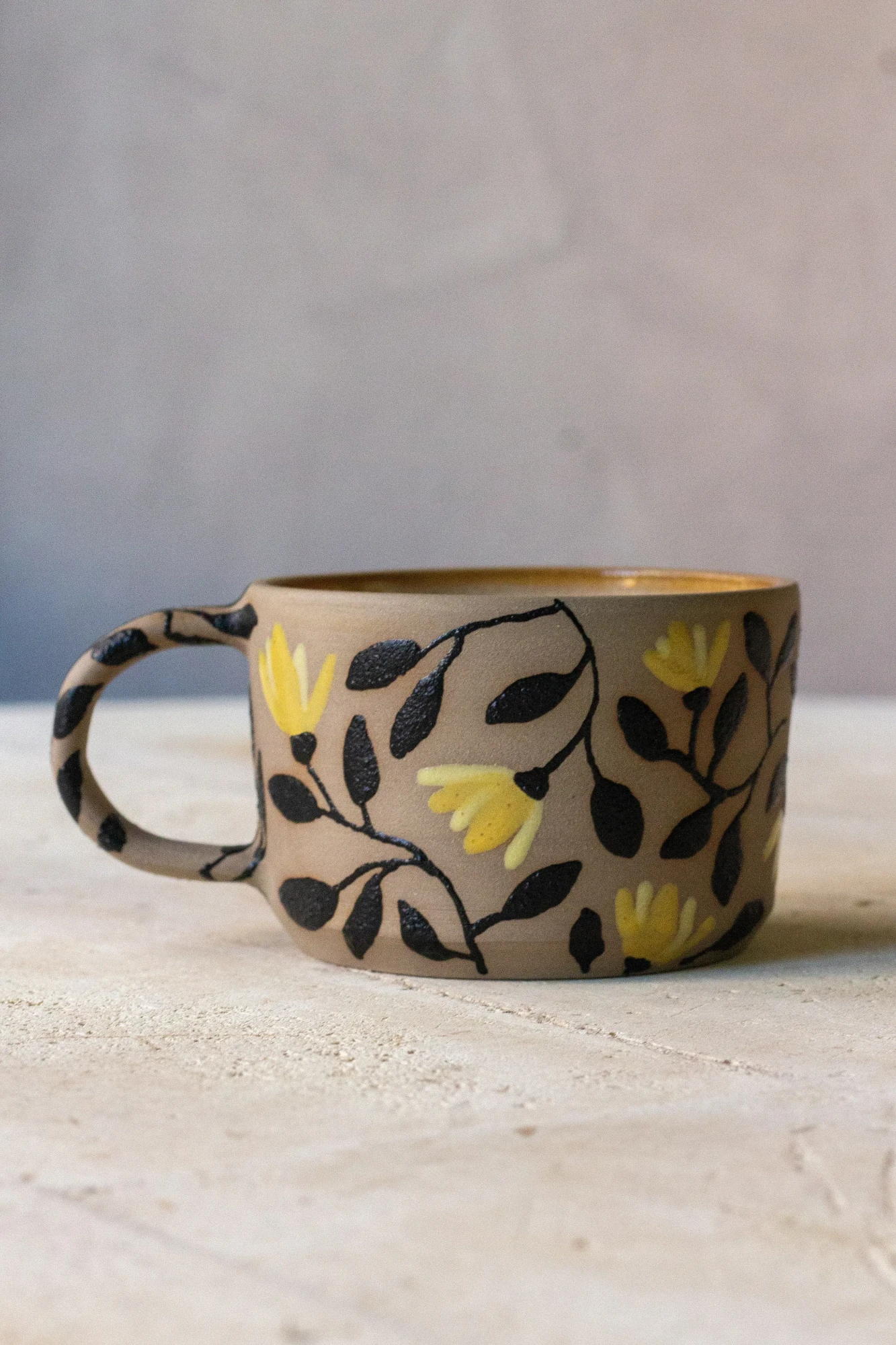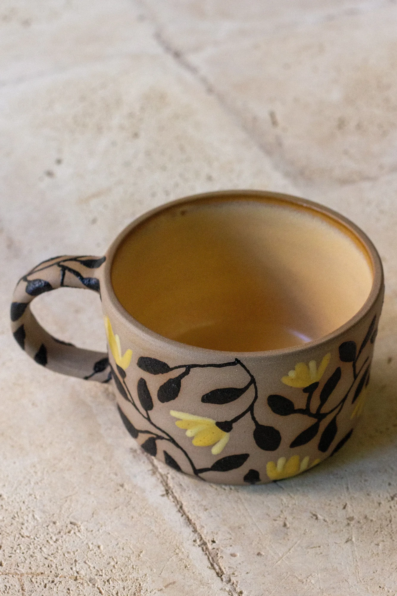 This handmade stoneware mug features a calm, botanical design painted by hand. Soft black branches and small yellow flowers move around the surface, creating a subtle, graphic pattern against the warm clay body. Its balanced shape and comfortable handle make it easy to reach for every day, while the softly glazed interior adds a gentle contrast. Each mug is individually made and painted, so no two are exactly alike.